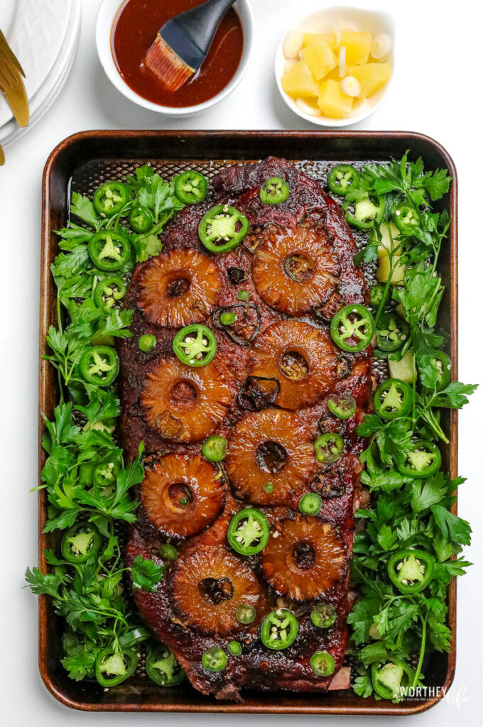- Brush a tablespoon of olive oil onto a single sheet of foil. Place a can of pineapple rings onto the foil in a straight overlapping line. Scatter three sliced jalapenos over the pineapple slices. Then, place the ribs directly over the pineapple and jalapeno peppers.