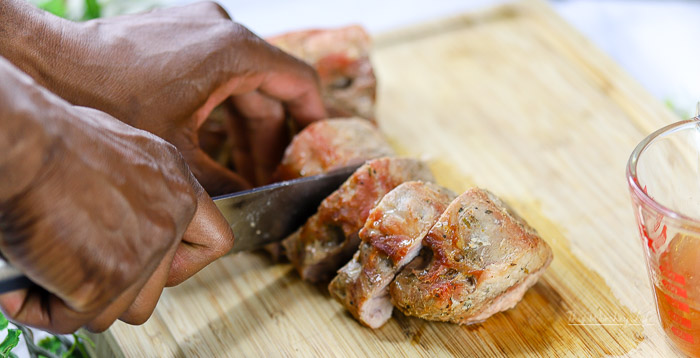11. Slice and chop the pork into small bite-size pieces.