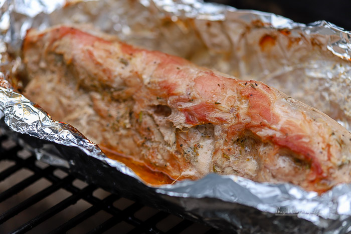 Let’s pause for a moment and talk about this Smithfield® fresh marinated pork. This is the ideal pork when I don’t have time to fool around with making my own marinade because this one comes prepackaged and perfectly seasoned. Birthday parties, quick dinner ideas, summer BBQ parties, it doesn’t matter the occasion, Smithfield Marinated Fresh Pork is here to do the job.  No fuss, just open and place it in the center of aluminum foil and fold the edges over the meat. See how I grilled it below.