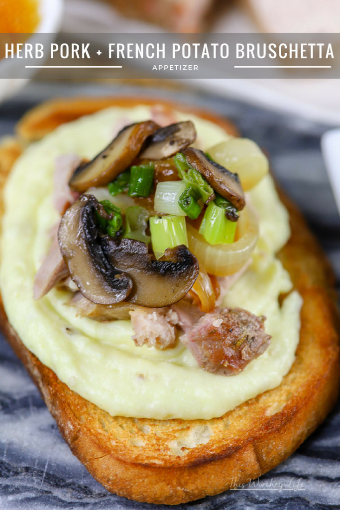 Bruschetta recipes are known to be quick to make and delicious to eat. I believe in that concept, but put a twist on making bruschetta, by adding a few of my favorite comfort foods. With French-style potatoes, roasted garlic + herb pork, along with fresh veggies and a few other things, this loaded bruschetta will turn heads when served! Grab the recipe for my Herb Pork + French Bruschetta recipe below!