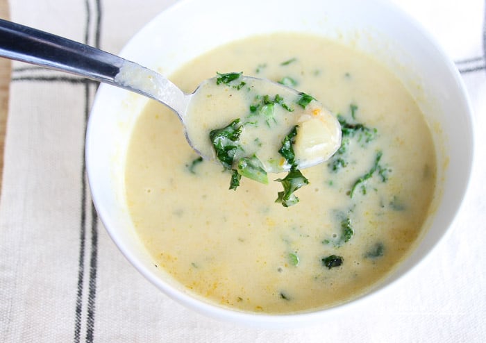 - When the kale is bright green, add it to the soup or reserve to add on top of the soup.