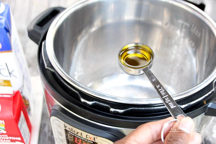 - Add two tablespoons of extra virgin olive oil into the Instant Pot® and press the Sauté button.