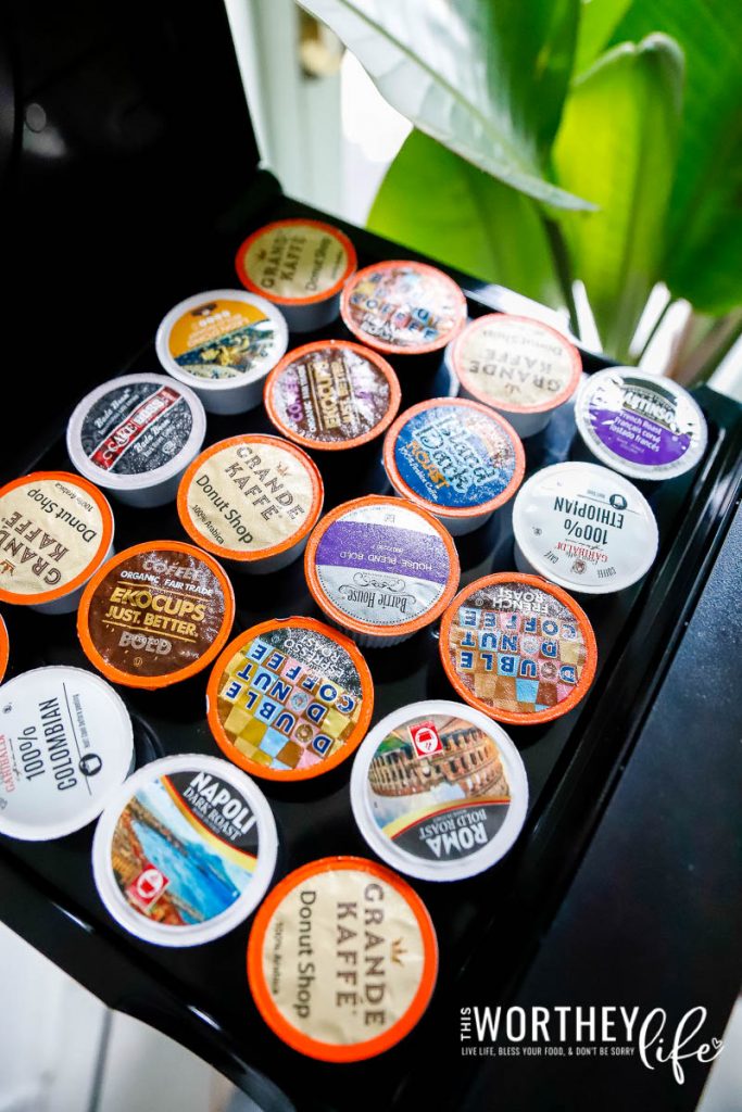 And I love how we can store 20 coffee pods in the flip-open storage area on top.