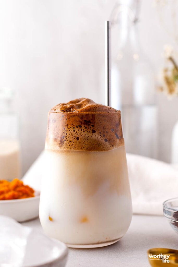 - Add ice to a cup, pour the milk, and then top with the whipped pumpkin coffee mixture.