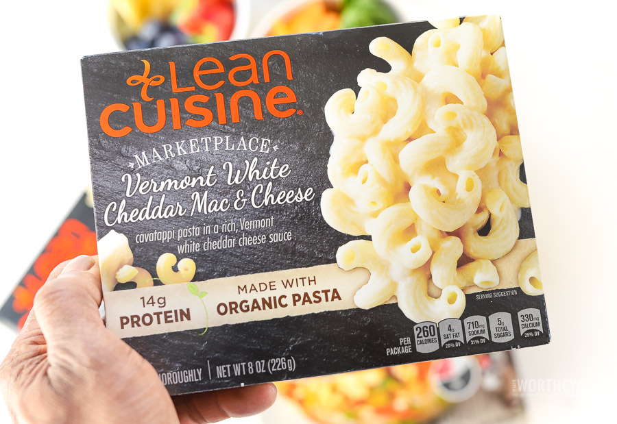- It is made with Organic Ingredients: LEAN CUISINE Vermont White Cheddar Mac & Cheese. This is my all-time favorite after the workout or just-because-meal. It is made with no artificial colors, flavors, or preservatives. And it’s another meatless option with no GMO ingredients. Packed with 14 grams of protein and made with organic pasta. We’re talking 100% organic cavatappi pasta complemented with a rich Vermont white cheddar cheese sauce!