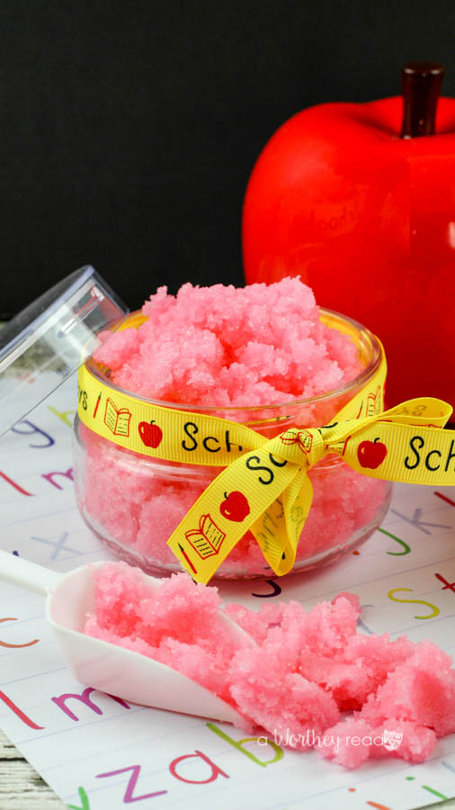 The bright pink colors of this homemade sugar scrub are so much fun! You can add a ribbon as shown and gift it to a teacher, or you can simply store and use yourself for some luxurious at-home pampering.