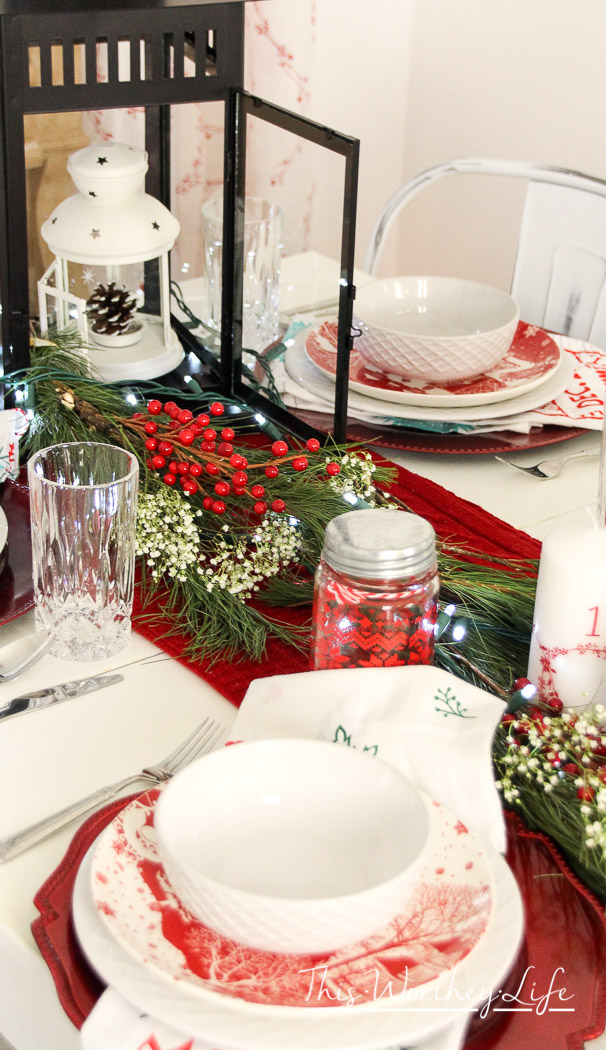 I placed the candles throughout the center of the table, red Christmas pattern mason jars, and two white trees.