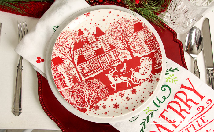 I started with a red charger for each place setting, followed by a Merry Christmas kitchen cloth, a Basketweave Dinner Plate and bowl, and a Winter Wonderland Holiday Plate.