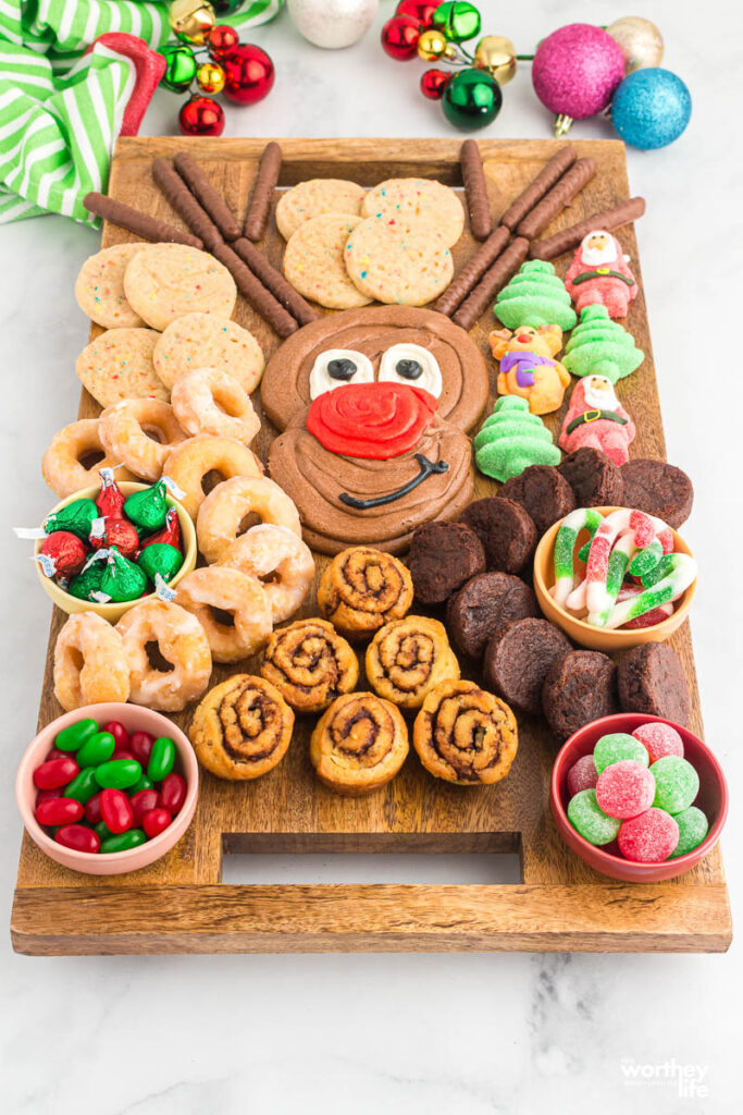This is an adorable reindeer buttercream board you can make and serve up for a movie night at home, a holiday party, or a treat just for snacking.