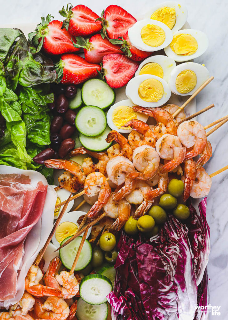 Our version of a Salmagundi Board contains seafood and sliced preserved meats, fresh garden veggies, hard-boiled eggs, sweet strawberries, and brined olives.