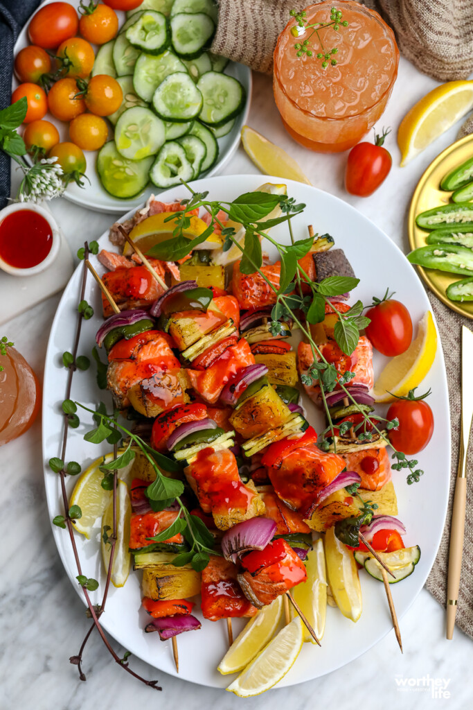 Salmon. For the salmon, I like grabbing the thickest filet of salmon I can find. The larger pieces hold up better when cooked on the skewer.