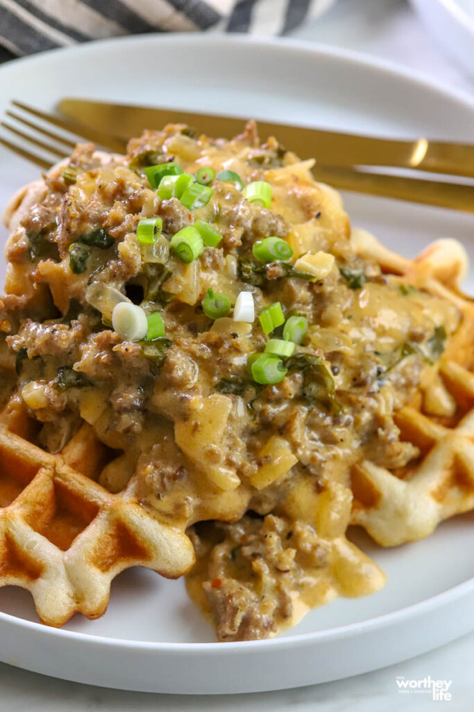 This sausage gravy over waffles recipe is a simple breakfast, dinner, or brunch idea you will love to whip up for your family or a crowd.