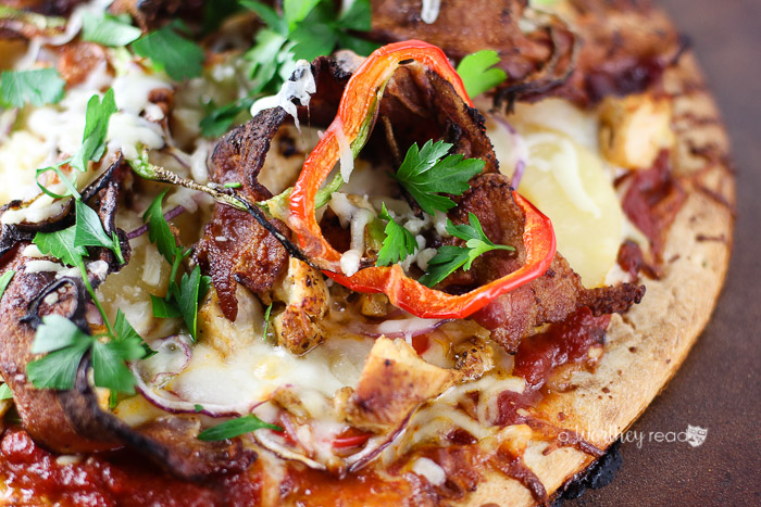 - Place the prepared thin crust pizza crust on a pizza stone, spoon on the marinara sauce and spread evenly, add shredded cheese, green and red peppers, pineapple, red onions, chopped chicken pieces, thick-cut bacon, and more shredded cheese.