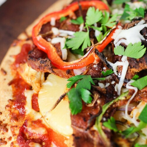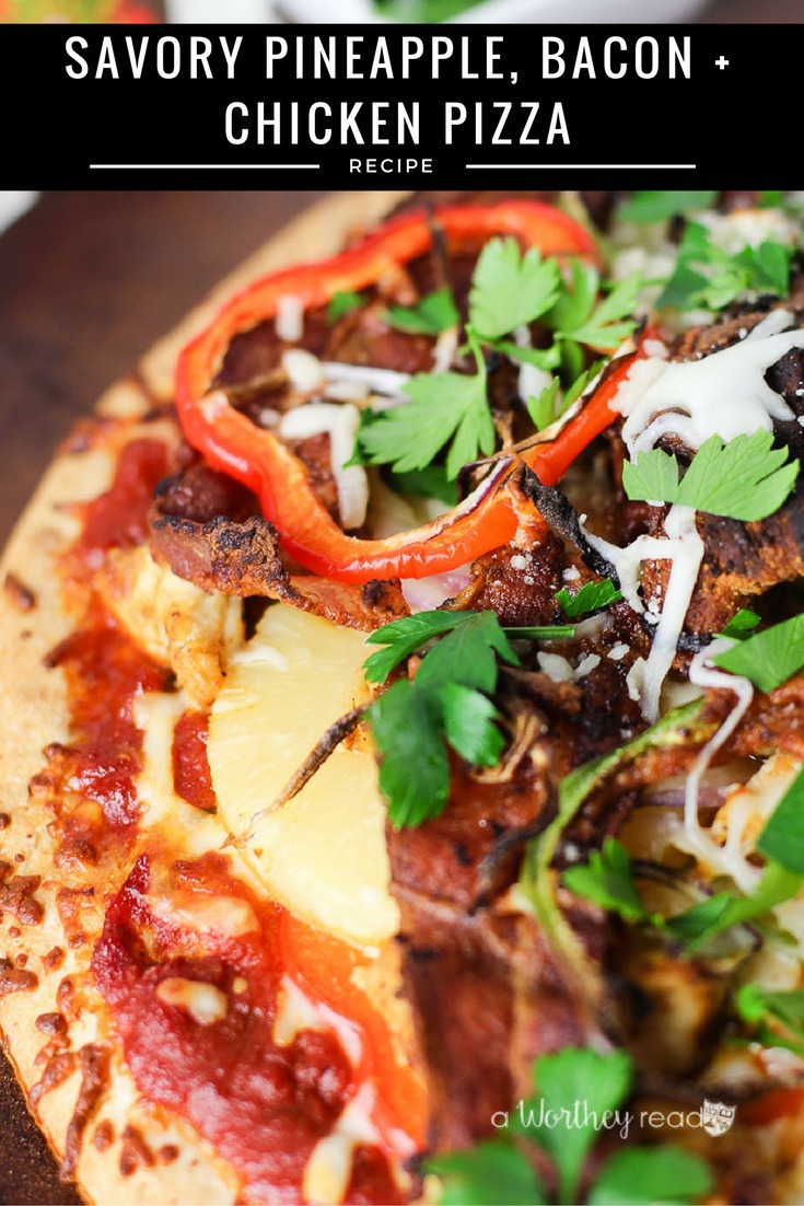 Pizza night at our house is a long-held tradition, and the one thing about tradition is, don’t mess with tradition. Period! Pizza night especially holds true the day of the Super Bowl. Having a Super Bowl party at home without exceptionally good food is a big no-no. Talk about a foul on the play and it can’t happen. If you love pizza like we do then our homemade Savory Pineapple, Bacon + Chicken Pizza is the perfect game day football food to ensure maximum yardage on full flavor. No flags were thrown on this recipe. This one is flying high, right between the goal posts and without a doubt good for the extra point.