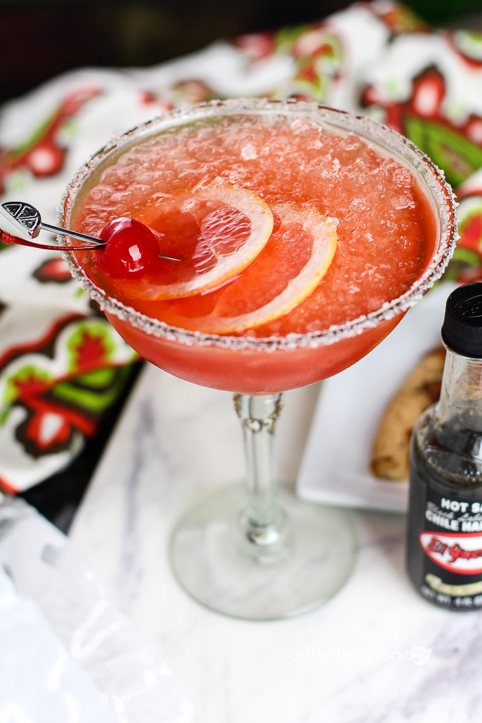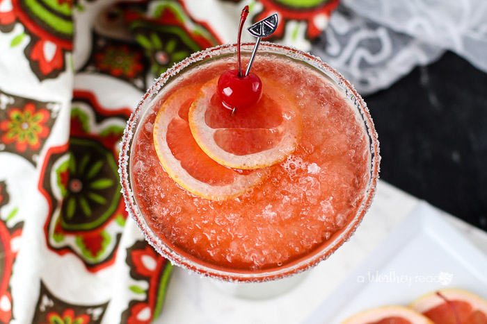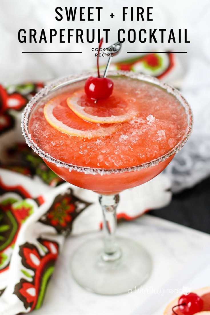 - Garnish with two slices of grapefruit and a stemmed Maraschino cherry.