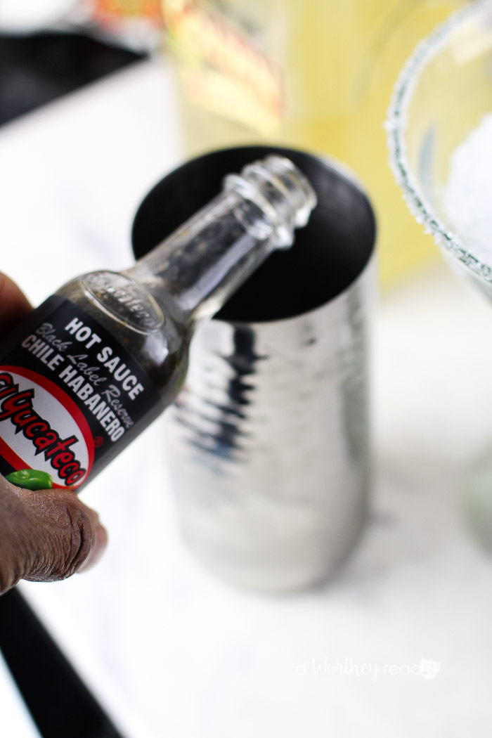 - In a cocktail shaker add agave nectar, Maraschino cherry juice, pineapple juice, spiced rum, margarita mix, El Yucateco® Black Label Chile Habanero Hot Sauce, and ice.