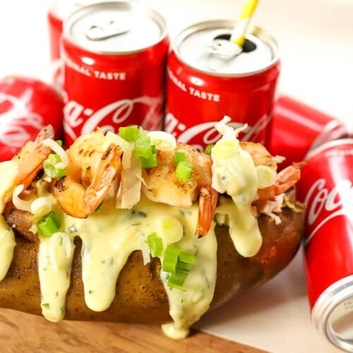 There’s no foul on the play when you serve up this Big Game Day treat! We’re talking about our mega Loaded Chicken & Shrimp Baked Potatoes, which goes great with a refreshing Coca-Cola. So go ahead and blitz your taste buds with this big savory and cheesy recipe. We’re making everyone at your next home tailgate party extra happy with this incredible starting lineup! Plus, it’s so easy to make using rotisseries chicken, it’s like throwing a game-winning Hail Mary right into the flavor zone!