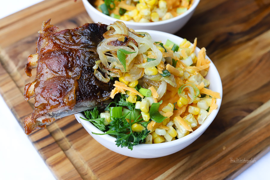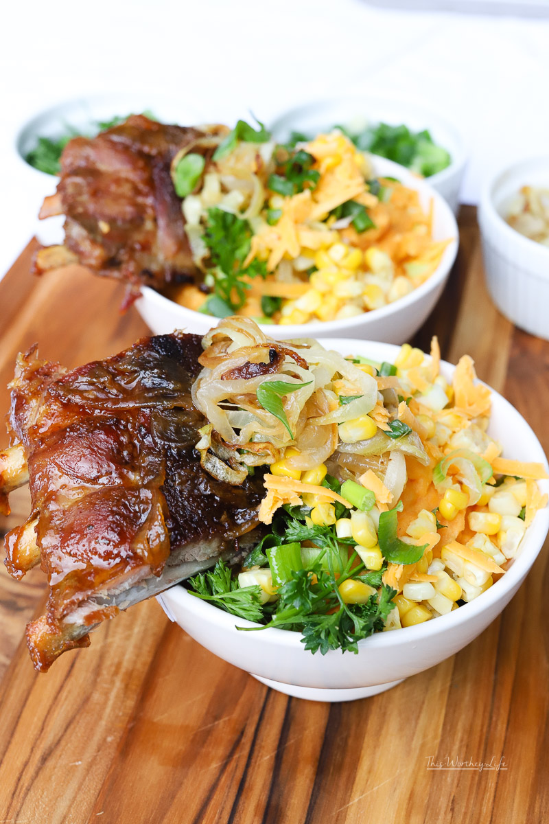 The co-star of this movie food magic is the Tyrannosaurus ribs! Okay, I used baby back ribs, but only because the local butcher shop was fresh out of slabs of T-Rex. These ribs took this recipe and pretty much made it an Oscar contender. It’s all of the thing’s ribs should be: moist, falling off the bone tender, and with lots of brown sugar sweetness mixed with a tangy spice rub. So good!