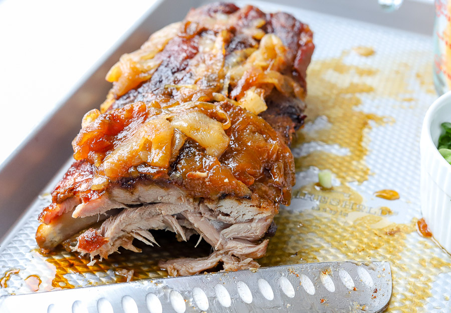 - Brush a tablespoon of olive oil onto a single sheet of foil, place the onions onto the foil in a straight overlapping line, then place the ribs directly over the onions.
