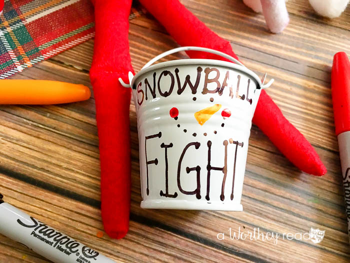 1. On the front of your bucket write “snowball fight” with your black sharpie, leaving a space in between for your snowman