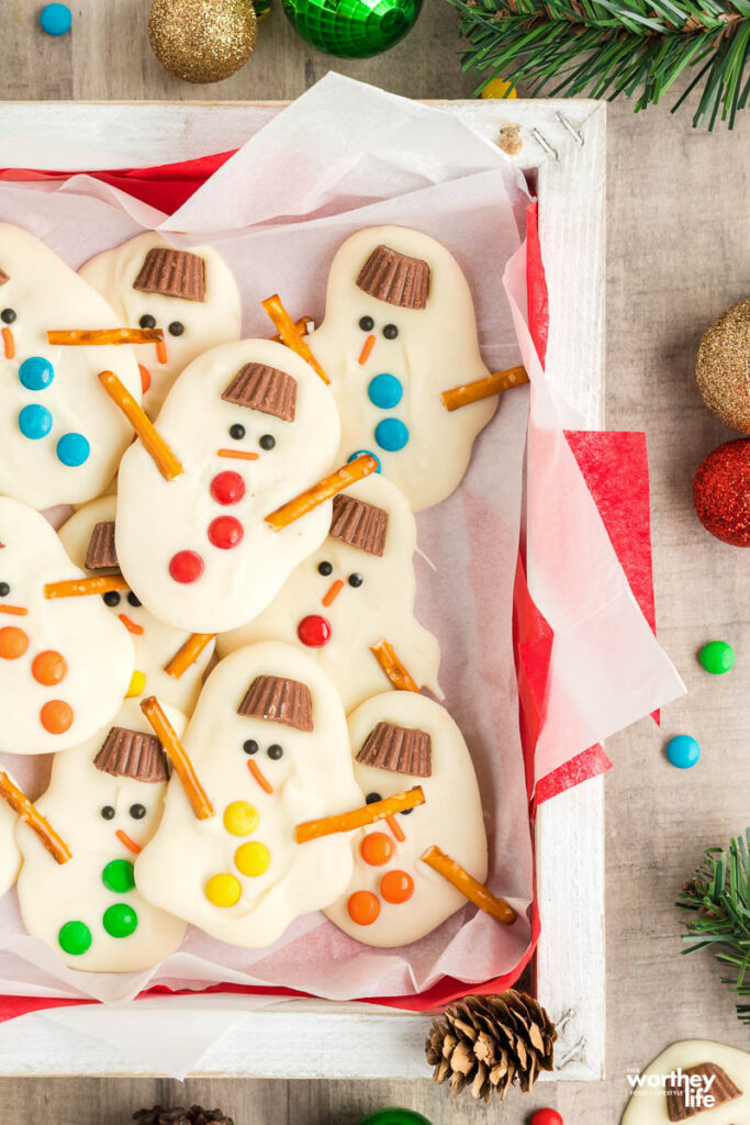 This melted snowman bark is a festive chocolate treat, great for serving up to friends and family, taking to school parties, or even a holiday movie night.