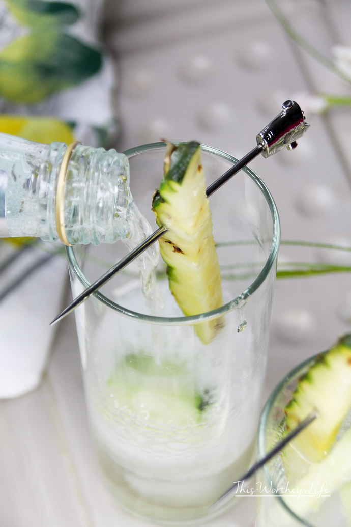 Next, top the mocktail off with your favorite tonic water. Using a long-handled bar-spoon give the mocktail few turns. Garnish wiht slices of fresh cucumber and thin slabs of pineapple.