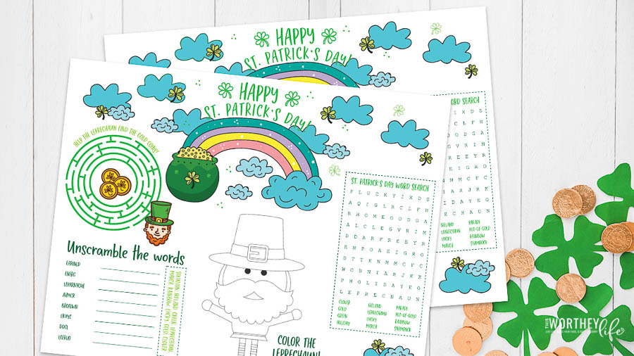 I love the addition of the word search and the word unscramble. Younger kids will enjoy the chance to color their own leprechaun, and everyone loves a simple maze! This is a super fun addition to your day.