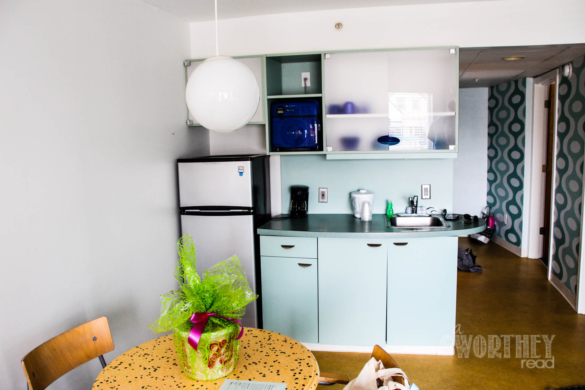 We enjoyed a three-room suite, with a large area functioning as a combo living, dining, and kitchenette situation. There are flat-screen TVs, a cool retro microwave, and a medium size refrigerator. The bedrooms worked out perfectly for our family of 5; the larger bedroom has 2 Queen size beds, and the smaller bedroom has a single Queen bed. You will also find the couch in the living room situation is a sleeper bed, what a nice surprise. Who knew?!