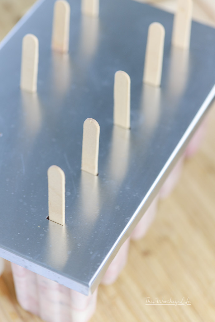 I’ve got a license to chill! We’ve filled the popsicle molds to the tippy top and now let’s “stick” it to ’em real good!