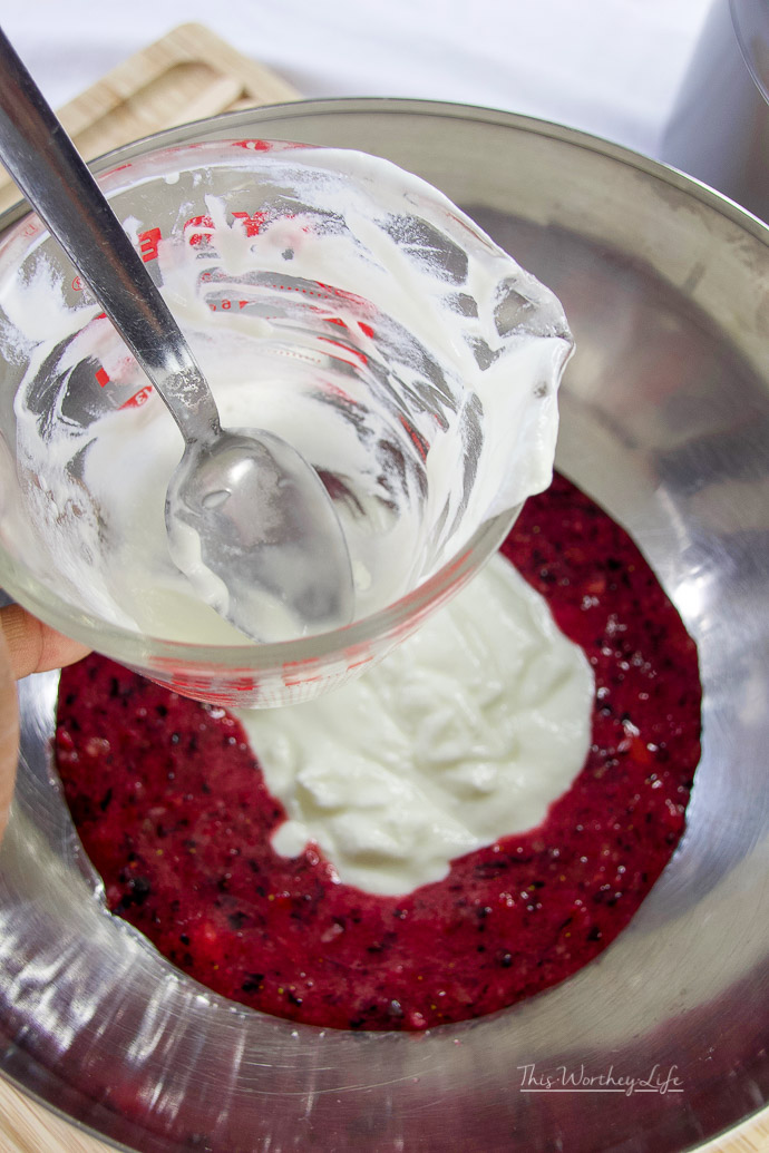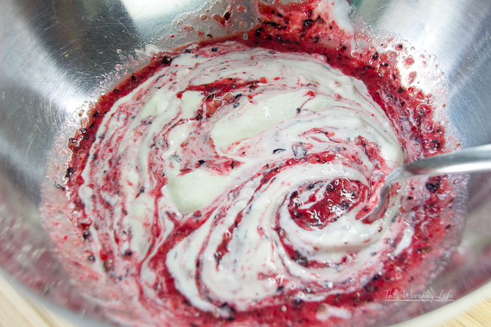 Pour the pulpy berry mixture into a bowl then plop in the yogurt, hold on we’re almost there!