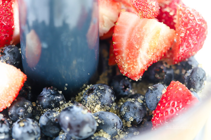 Into a food processor goes the strawberries, blueberries, agave, and raw date sugar. Where are they going? They’re goin’ for a spin!