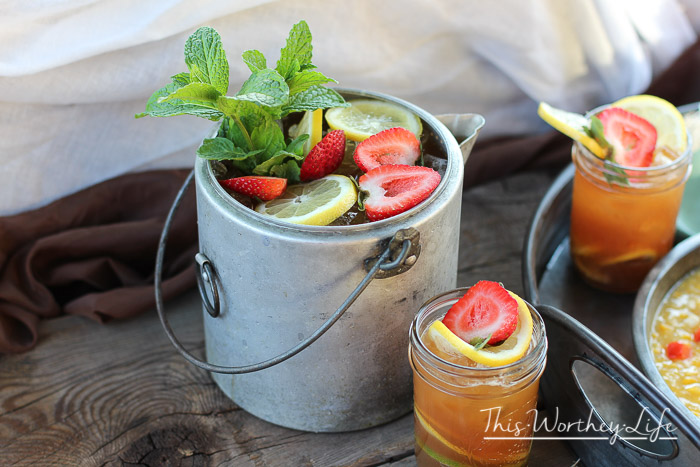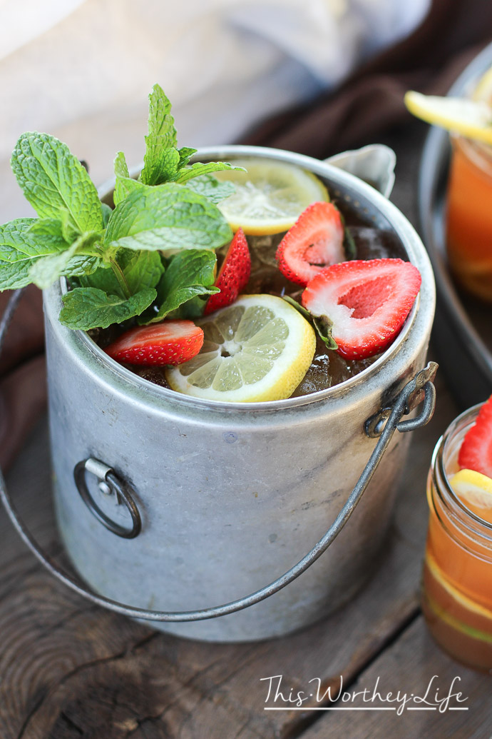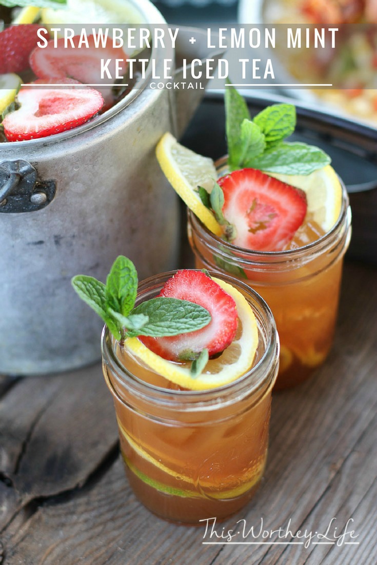 What do you get when you mix up an ice-cold batch of Jack Daniels Rye, summer sun tea, strawberry and lemon simple syrup, fresh sliced strawberries, and lemons, with fresh sprigs of mint? Well, what you get a kettleful of is our deliciously refreshing Strawberry + Lemon Mint Kettle Iced Tea! If like getting all of the summertime fun and turning it into a cold sunshine in a glass!
