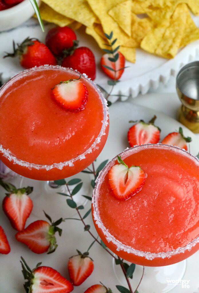 - Serve in salt- or sugar-rimmed glasses with sliced strawberries and lime.