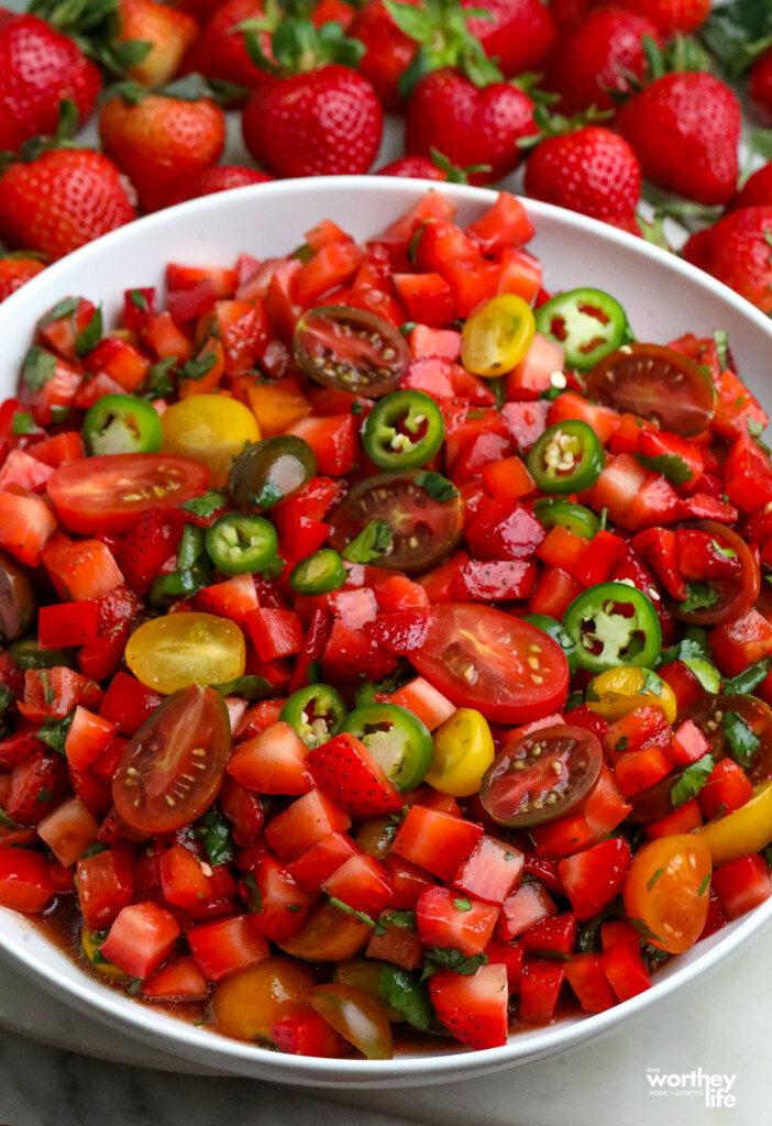 This easy strawberry salsa with tomatoes has sweet, spicy, and tangy flavors.