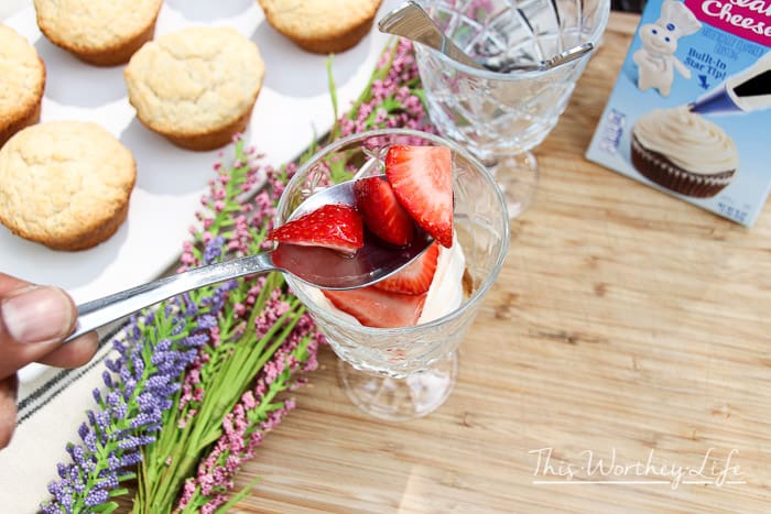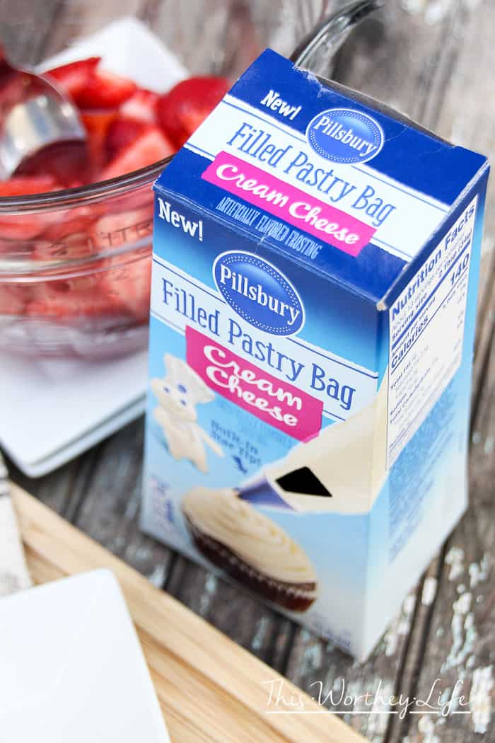 - Into a serving glass crumble half of a biscuit, top with strawberry mixture, then add a layer of Pillsbury Filled Pastry Bag Cream Cheese Frosting. Top with remaining crumbled biscuit, more strawberries and strawberry syrup, finish with more cream cheese frosting and a single strawberry.