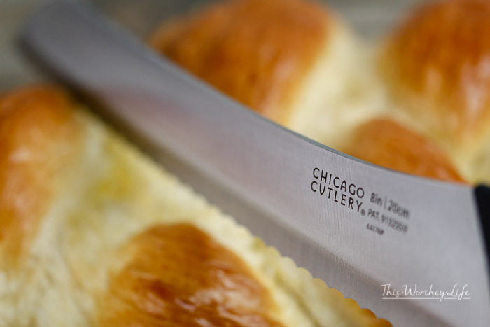 I cut the Challah (pronounced without the C) into 1/2 inch slices with my Chicago Cutlery Serrated Bread Knife, but if you desire thicker slices then, by all means, go big or go home! Wait, you’re already home aren’t ya?!