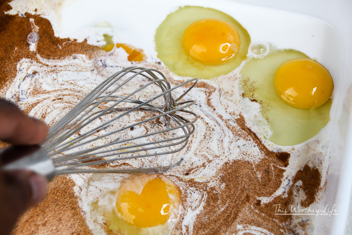 - In a large bowl add fresh eggs, half and half, light brown sugar, pure vanilla extract, ground cinnamon, and a pinch of sea salt. Using a whisk combine all of the ingredients until the egg yolks are dispersed with no clumps.