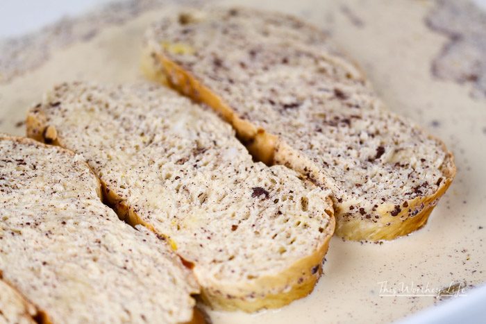 - Pour the French toast batter into a large high-walled dish, place the cut bread slices into the batter and let them soak for about four minutes.