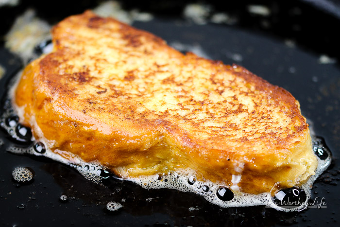 Allow the bread to soak up all of the French toast batter goodness for four minutes per side, you won’t regret it not one little bit!