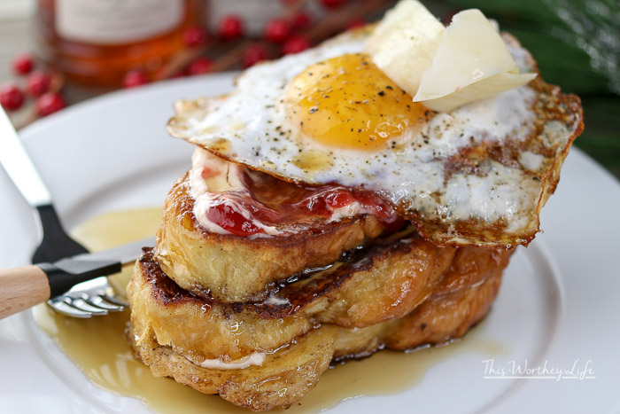 - Pour about 2 ounces of Stonewall Maine Maple Syrup into the center of a warmed plate. Place a slice of French toast on a plate and add the Strawberry Champagne Jam Cream Cheese, then add another slice of French toast and repeat the process. Add the fried sunnyside-up duck egg on top and add shavings of Gruyère cheese. Serve.