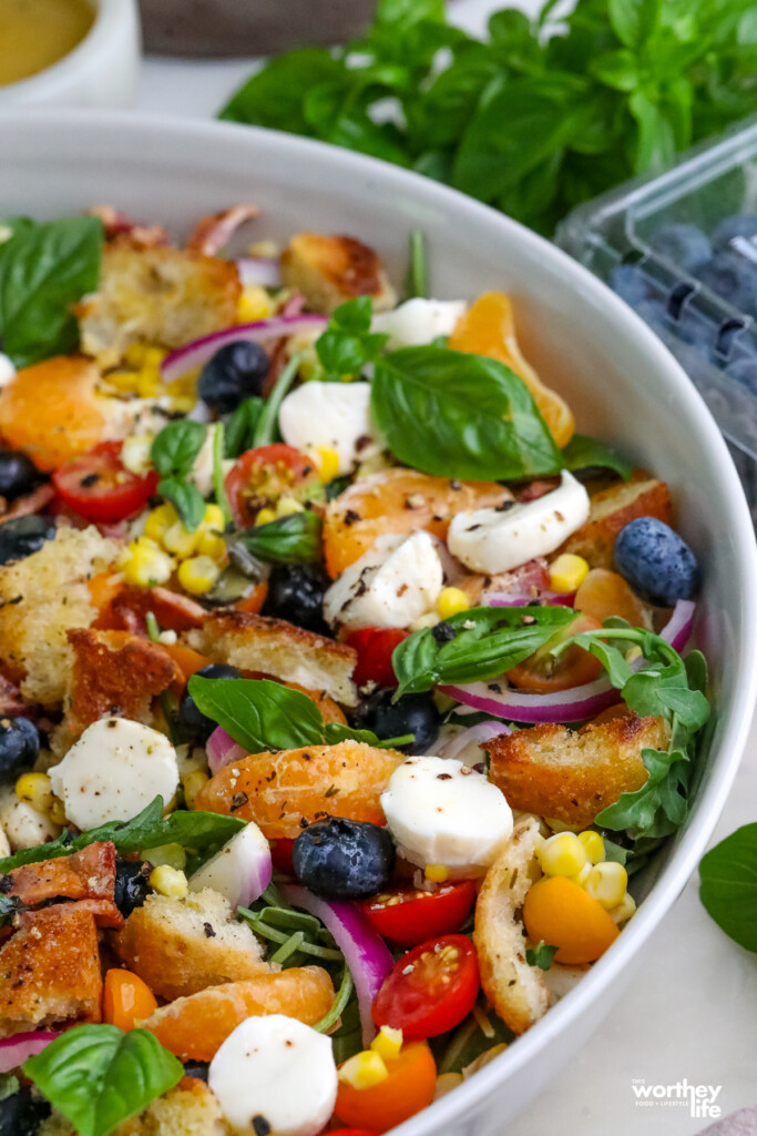 Fresh and vibrant, this Summer Salad with Blueberries features peppery arugula, fresh corn, crispy bacon, juicy tangerines, cherry tomatoes, and mozzarella tossed in a homemade vinaigrette.