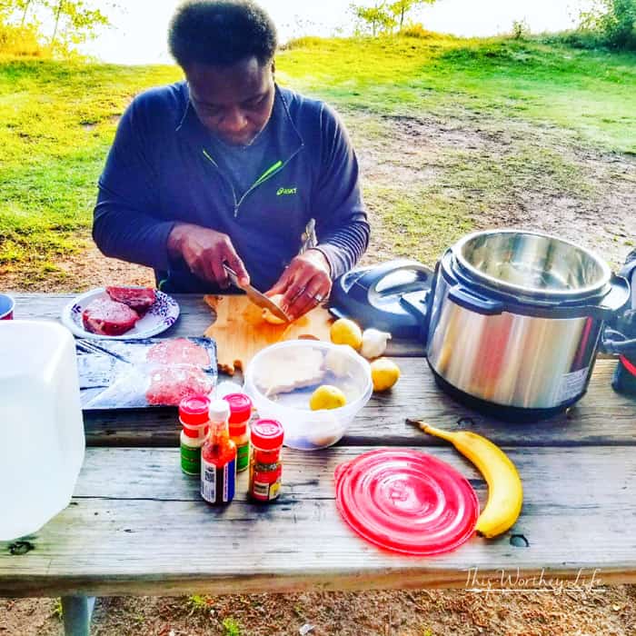 After we said goodbye to them, Derrick pulled out the Instant Pot and got to work on our glamorous breakfast of steak and rice. That’s the joy of camping with a Sorento. With the 110v inverter outlet, we were able to cook our breakfast, plus charge all of our devices!
