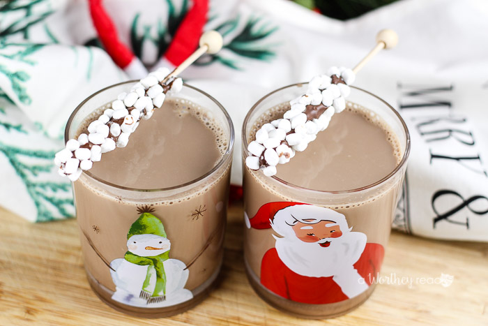 - Until each mug pours two cups of hot chocolate. Stir well and top with roasted marshmallows or just add a cool little marshmallow and chocolate stir sticks. We got ’em at Home Goods.
