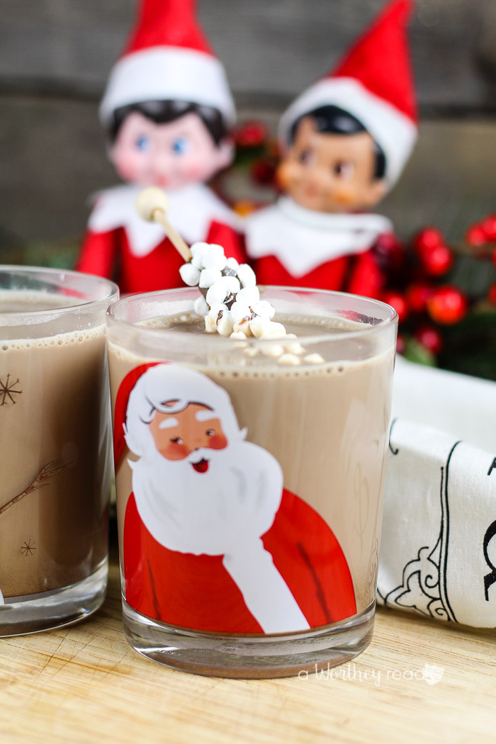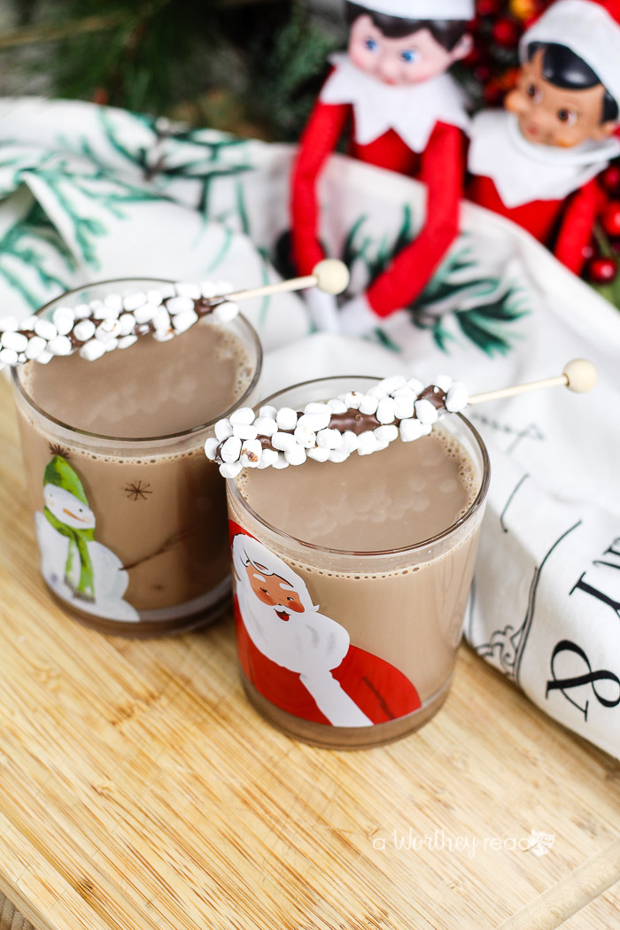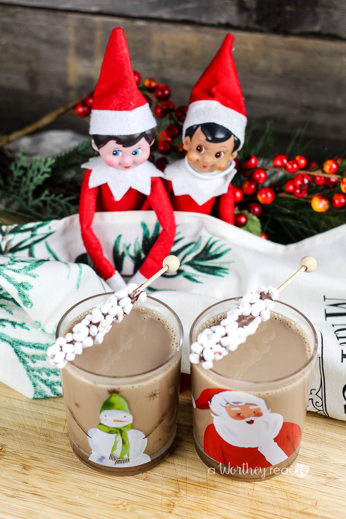 And look who showed up at our little hot chocolate party. It’s Jacob and Madelaine! Our little shelf elves arrived a little early this year; maybe it’s because Tatanisha started playing Christmas music super early, like two-weeks before Thanksgiving, she’s absolutely mad! It is always interesting around our house upon the arrival of our little elf friends. But you know what? Elfie hasn’t arrived yet. Hmm? I wonder where he is? Okay, let’s get back to the hot chocolate business because that’s kinda a priority, right?