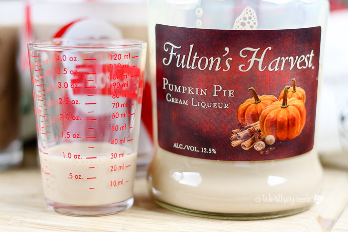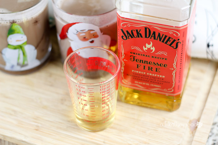 - Into a two mugs add one (1) ounce of Jack Daniel’s Tennessee Fire whiskey and two (2) ounces of Fulton’s Pumpkin Pie Liqueur. Mix well.