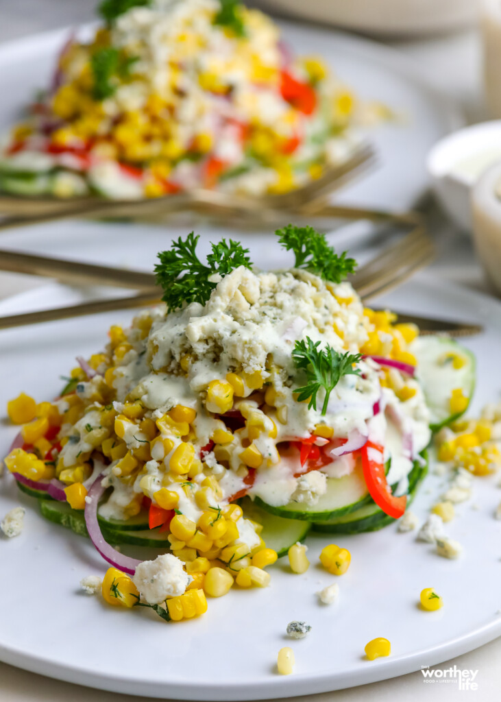 This salad is crisp, creamy, and herby, with just the right balance of sweet corn, tangy dressing, and savory cheese.