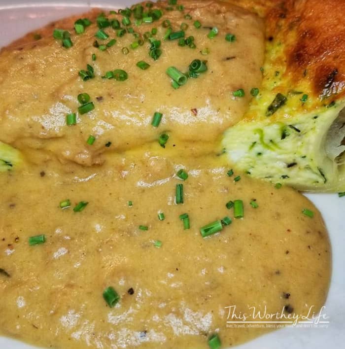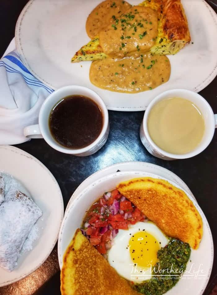 I ordered the delicious, yet, light and cloud-like Quiche which was topped with a heaping ladling of Sausage Gravy. I’ve recently been on the hunt for a good quiche, and I had high hopes for this one. Fresh Beignets and a pot of French roasted coffee rounded out our order. We people-watched and made small talk while waiting for our food to arrive. Are you a people watcher too? Surely, there are others.