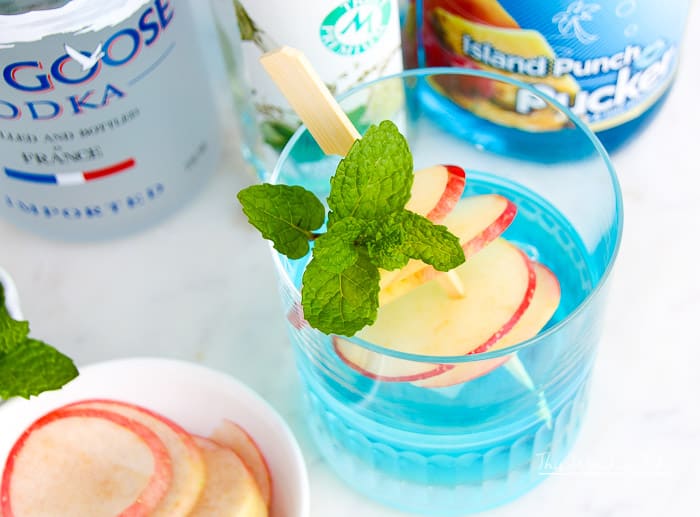 - Into a bar glass add the mint simple syrup, Grey Goose Vodka, and Blue Island Schnapps.