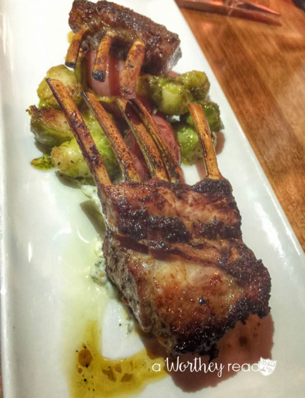 Now, for the main event, I decided to go with a rack of lambs. Best choice I could have made that night. It was a New Zealand Rack of Lamb encrusted with fresh herbs, served over fingerling potatoes and brussel sprouts sauteed with white wine and garlic. I could have eaten about three servings of that lamb. It was juicy and tender and packed with a ton of flavor.