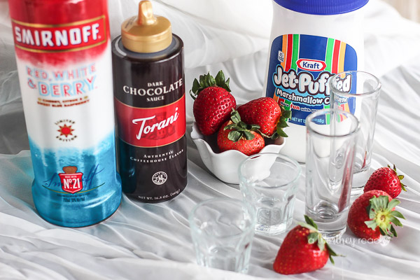 - Fill a shot glass halfway with mixture and top with a whole or sliced strawberry.